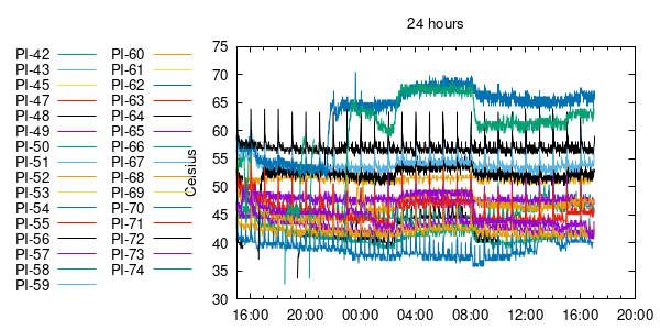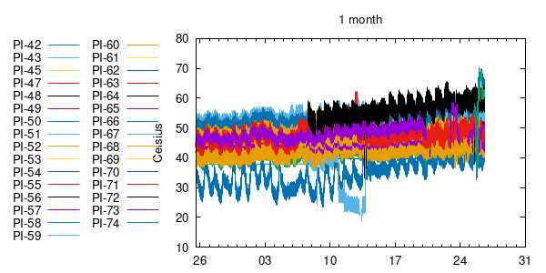 | PI-42 | 33.628 °C 08:25:06 | 37.932 °C 03:18:05 | 43.312 °C 16:04:07 | 41.160 °C 10:15:06 | PI-43 | 36.856 °C 14:57:04 | PI-45 | 39.008 °C 21:40:06 | PI-47 | 44.388 °C 00:06:03 | PI-48 | 41.698 °C 10:07:10 | PI-49 | 38.470 °C 11:32:02 | PI-50 | 39.546 °C 08:25:03 | 41.160 °C 16:19:03 | 52.996 °C 15:03:03 | 43.312 °C 17:02:02 | PI-51 | 49.388 °C 21:02:02 | PI-52 | 48.312 °C 08:25:03 | 49.388 °C 00:42:03 | 56.920 °C 12:03:04 | 50.464 °C 16:14:02 | PI-53 | 42.236 °C 18:11:03 | PI-54 | 29.324 °C 08:25:04 | 34.166 °C 16:52:04 | 43.312 °C 07:58:42 | 37.394 °C 20:54:06 | PI-55 | 42.236 °C 15:39:03 | PI-56 | 41.160 °C 19:51:04 | PI-57 | 36.856 °C 08:25:04 | 39.546 °C 05:54:03 | 47.616 °C 16:03:04 | 41.160 °C 22:31:03 | PI-58 | 44.388 °C 15:27:04 | PI-59 | 39.546 °C 22:39:17 | PI-60 | 36.856 °C 08:25:05 | 38.470 °C 01:59:04 | 46.540 °C 10:04:06 | 40.084 °C 09:47:04 | PI-61 | 40.084 °C 09:34:03 | PI-62 | 35.780 °C 00:26:03 | PI-63 | 51.002 °C 16:15:01 | PI-64 | 49.660 °C 08:25:02 | 47.712 °C 04:58:02 | 55.017 °C 13:05:02 | 51.121 °C 20:43:02 | PI-65 | 43.329 °C 08:25:03 | 45.277 °C 14:37:02 | 52.095 °C 06:03:03 | 48.199 °C 07:43:02 | PI-66 | 42.932 °C 14:50:01 | PI-67 | 49.388 °C 08:25:07 | 48.312 °C 03:33:02 | 63.376 °C 13:03:02 | 52.078 °C 21:14:02 | PI-68 | 42.932 °C 08:25:02 | 41.856 °C 02:19:03 | 52.078 °C 12:06:07 | 45.084 °C 19:16:03 | PI-69 | 42.932 °C 16:21:02 | PI-70 | 47.950 °C 08:25:01 | 62.800 °C 04:02:01 | 72.150 °C 10:03:01 | 65.550 °C 09:15:01 | PI-71 | 47.236 °C 08:25:02 | 41.856 °C 01:18:02 | 52.616 °C 16:03:03 | 44.008 °C 20:45:02 | PI-72 | 46.698 °C 08:25:07 | 54.768 °C 04:56:02 | 64.452 °C 15:03:03 | 57.458 °C 14:59:02 | PI-73 | 38.090 °C 08:25:03 | 39.166 °C 12:45:01 | 58.534 °C 16:19:20 | 43.470 °C 17:58:03 | PI-74 | 47.950 °C 08:25:01 | 45.200 °C 00:09:02 | 54.550 °C 13:23:02 | 47.950 °C 06:22:02 | PI-75 | 46.160 °C 13:28:04 | 46.698 °C 11:40:02 | 49.926 °C 00:41:02 | 48.850 °C 22:08:02 | PI-76 | 45.084 °C 08:25:02 | 48.312 °C 04:17:02 | 52.616 °C 15:01:01 | 49.926 °C 21:21:02 |