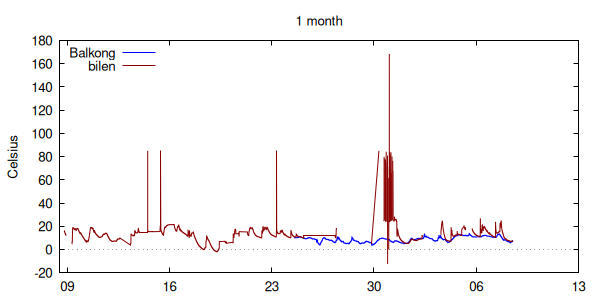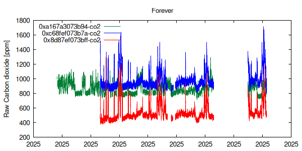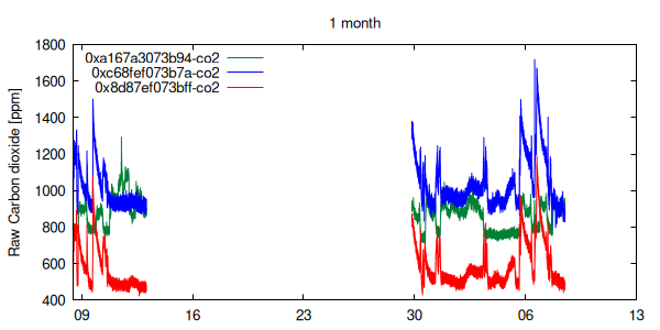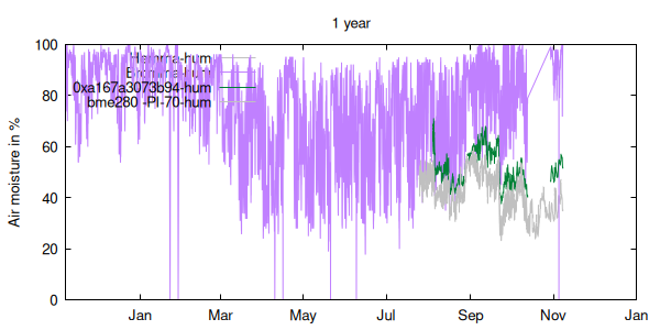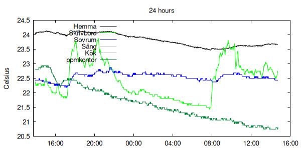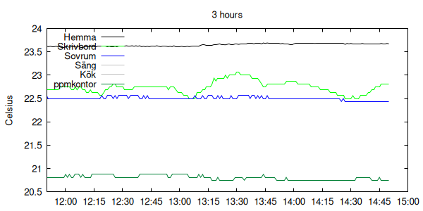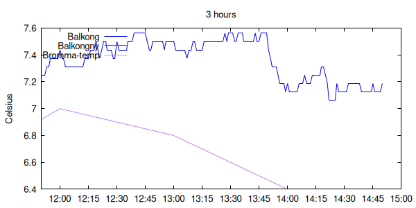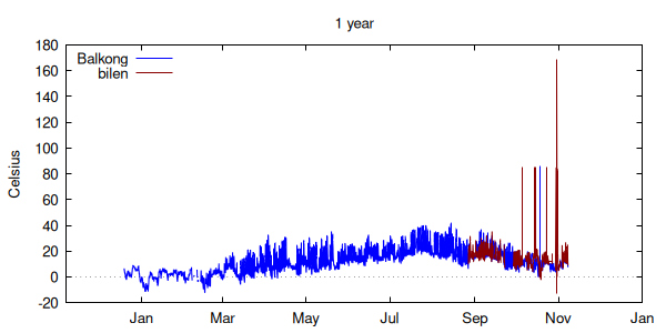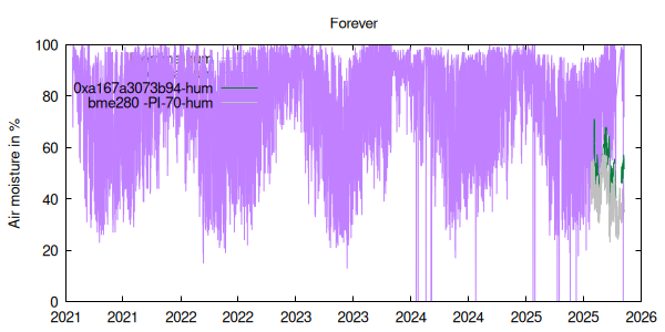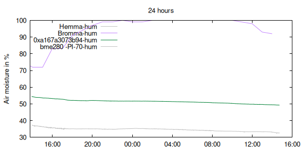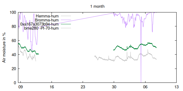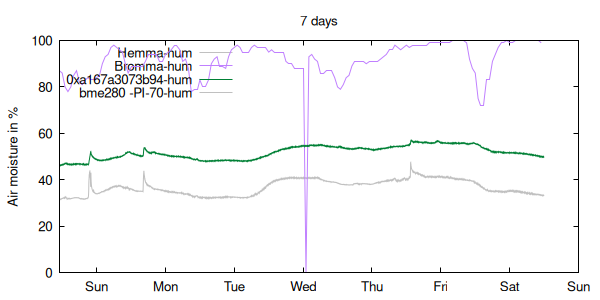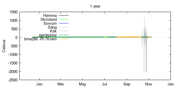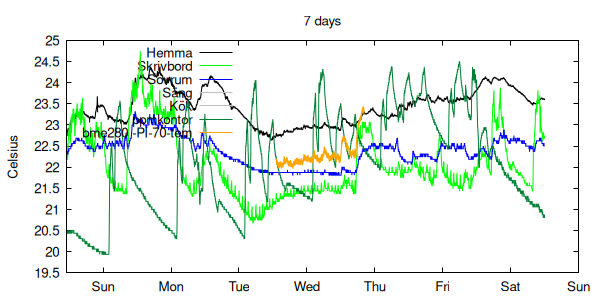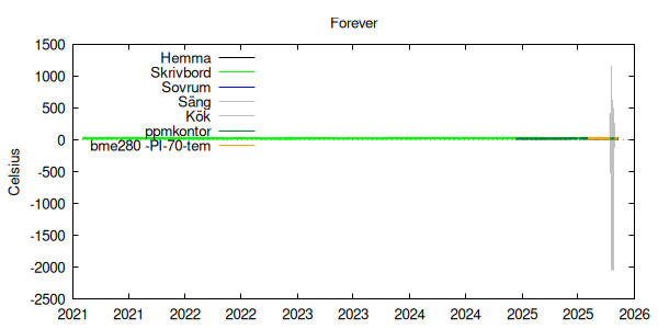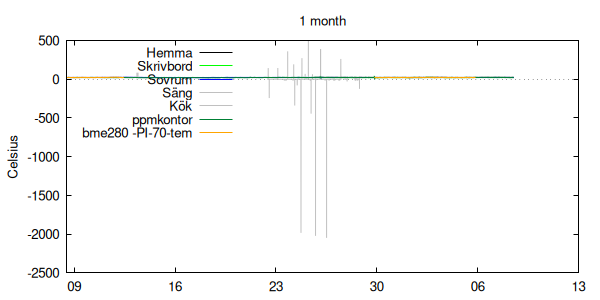 | Balkong | PI-42 | 5.937 °C 08:25:06 | 5.812 °C 07:26:05 | 8.437 °C 00:14:05 | 10.687 °C 05:04:07 | Hemma | PI-64 | 23.510 °C 08:25:02 | 23.470 °C 07:49:01 | 23.950 °C 00:03:01 | 23.820 °C 11:58:02 | 0xa167a3073b94-tem | PI-76 | 19.970 °C 08:25:13 | 19.940 °C 08:09:14 | 20.430 °C 00:01:13 | 20.240 °C 03:19:13 | 0xc68fef073b7a-tem | PI-67 | 20.890 °C 08:25:18 | 20.840 °C 08:01:14 | 21.540 °C 00:09:14 | 22.200 °C 07:30:13 | 0x8d87ef073bff-tem | PI-72 | 23.180 °C 08:25:19 | 23.110 °C 08:00:18 | 23.930 °C 02:02:14 | 24.210 °C 19:31:14 | bme280 -PI-70-tem | PI-70 | 0.000 °C 08:25:03 | 0.000 °C 00:01:02 | 0.000 °C 08:17:03 | 0.000 °C 11:41:02 | Serverskrubb | PI-52 | 29.125 °C 08:25:03 | 28.812 °C 05:40:03 | 29.562 °C 08:12:03 | 28.875 °C 13:43:02 | Skrivbord | PI-42 | 22.687 °C 08:25:06 | 21.437 °C 07:44:05 | 22.562 °C 08:17:06 | 21.937 °C 12:07:05 | bilen | PI-73 | 7.062 °C 08:25:03 | 7.062 °C 08:16:03 | 9.312 °C 00:13:03 | 14.187 °C 09:43:03 | Kylen | PI-54 | 4.500 °C 08:25:04 | 3.562 °C 07:35:04 | 4.625 °C 02:44:04 | 4.625 °C 12:50:05 | Kylen-slowed | PI-50 | 6.312 °C 08:25:03 | 6.250 °C 07:38:03 | 6.500 °C 00:05:04 | 6.437 °C 23:37:03 | Frysen | PI-54 | -20.437 °C 08:25:04 | -22.187 °C 04:19:05 | -17.500 °C 06:20:05 | -19.437 °C 19:28:04 | Kök | PI-75 | 25.000 °C 13:28:04 | ppmkontor | PI-65 | 21.062 °C 08:25:03 | 21.062 °C 07:52:02 | 21.750 °C 00:15:03 | 22.812 °C 13:52:03 | Sovrum | PI-60 | 22.375 °C 08:25:05 | 22.375 °C 06:42:04 | 22.750 °C 01:11:04 | 22.437 °C 14:07:04 | Säng | PI-68 | 22.437 °C 12:36:46 | test | ? | 25.937 °C 23:04:03 | test2 | PI-74 | 20.062 °C 16:59:33 | test3 | ? | 26.125 °C 12:44:03 | 0xa167a3073b94-co2 | PI-76 | 916 ppm 08:25:13 | 854 ppm 07:13:13 | 941 ppm 08:05:14 | 904 ppm 04:47:13 | 0xc68fef073b7a-co2 | PI-67 | 944 ppm 08:25:18 | 846 ppm 00:00:14 | 974 ppm 06:56:13 | 1047 ppm 10:39:14 | 0x8d87ef073bff-co2 | PI-72 | 471 ppm 08:25:19 | 451 ppm 03:18:13 | 549 ppm 02:12:19 | 608 ppm 13:25:13 | Vattennivå | PI-77 | 5 % 08:25:10 | 0 % 03:13:09 | 9 % 02:33:09 | 8 % 09:39:09 | waterlevel-realproc | PI-77 | 0.000 % 08:25:11 | 0.000 % 03:13:10 | 8.703 % 01:05:11 | 8.410 % 22:15:11 | waterlevel-avgproc | PI-77 | 0.462 °C 08:25:15 | 0.000 °C 04:24:15 | 8.516 °C 01:18:15 | 8.379 °C 14:31:15 | Vattennivå | PI-77 | 239 mm 08:25:12 | 230 mm 01:05:12 | 275 mm 08:05:11 | 232 mm 03:37:11 | vattentemp | ? | 21.562 °C 16:54:03 | Hemma-pre | PI-64 | 1010.626 hPa 08:25:02 | 1009.694 hPa 02:44:02 | 1010.830 hPa 07:47:02 | 1009.829 hPa 12:12:02 | bme280 -PI-70-pre | PI-70 | 1014.550 hPa 10:45:04 | Hemma-hum | PI-64 | 33.787 % 08:25:02 | 33.829 % 08:14:02 | 35.377 % 00:26:01 | 38.770 % 11:56:02 | 0xa167a3073b94-hum | PI-76 | 50.640 % 08:25:13 | 50.620 % 08:06:13 | 51.730 % 00:13:13 | 55.440 % 09:48:14 | 0xc68fef073b7a-hum | PI-67 | 47.610 % 08:25:18 | 47.590 % 07:16:14 | 48.110 % 01:20:19 | 49.770 % 09:40:14 | 0x8d87ef073bff-hum | PI-72 | 37.370 % 08:25:19 | 37.350 % 08:16:14 | 37.860 % 01:30:14 | 38.150 % 11:40:14 | bme280 -PI-70-hum | PI-70 | 30.429 % 10:45:04 | Bromma-temp | ? | 5.000 °C 07:00:00 | 5.000 °C 07:00:00 | 7.800 °C 00:00:00 | 9.700 °C 06:00:00 | Bromma-pre | ? | 1013.800 hPa 07:00:00 | 1013.000 hPa 03:00:00 | 1013.800 hPa 07:00:00 | 1013.000 hPa 12:00:00 | Bromma-hum | ? | 100.000 % 07:00:00 | 99.000 % 00:00:00 | 100.000 % 07:00:00 | 99.000 % 00:00:00 | Hemma2 | ? | 28.210 °C 16:47:02 | Hemma2-pre | ? | 1005.681 hPa 16:47:02 | Hemma2-hum | ? | 39.230 % 16:47:02 |