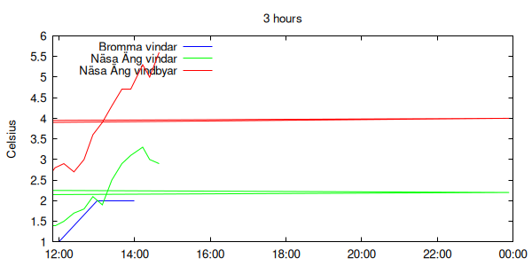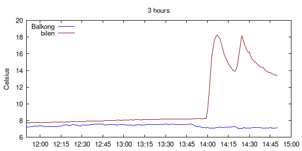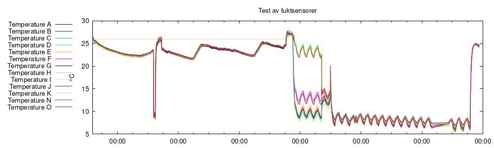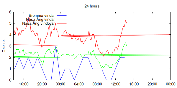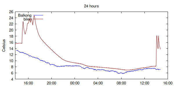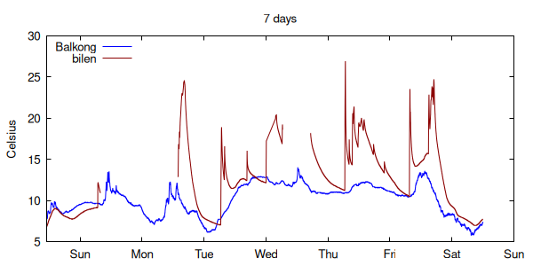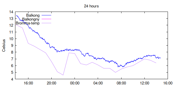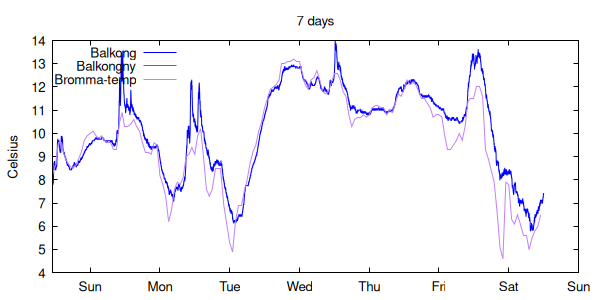 | Sensor | Senaste mätning | Dagens svalaste | Dagens varmaste | Gårdagens median |